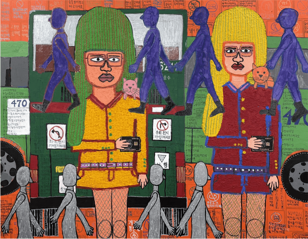 우수상을 받은 강원진의 ‘여성(女盛)시대 II 버스정류장’은 이야기가 풍부한 작품입니다. 정류장마다 정차하는 버스의 단속적인 운동 감각이 차창 밖 행인들 모습과 절묘하게 결합돼 있는 가운데 비슷한 옷차림과 헤어스타일의 두 여성이 블랙카드를 들고 서 있습니다. 작가는 평소 무엇을 해야 하고 하지 말아야 하는지 몰라 이를 기록하는 습관이 있다고 합니다. 그래서인지 작가가 버스를 타고 오가며 발견한 수많은 금지어와 지시어들을 그림 속에 깨알같이 적어 놓았습니다. ‘우회전시 끼어들지 마세요’에서 ‘정수기에 손을 씻지 마세요’, ‘물을 붓지 말고 바로 드세요’, ‘숨어있지 마세요’ 등의 문구가 두 대의 버스와 버스 노선도 사이사이를 채우고 있습니다. 모래를 섞은 아크릴 물감의 두터운 질감과 가벼운 붓 흔적의 대비가 그림을 보는 즐거움을 줍니다.