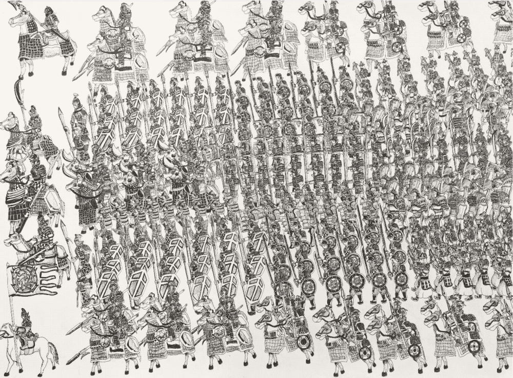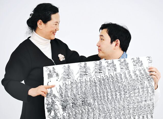 대상 수상작인 심규철의 ‘고구려의 행군’은 1차 심사 때부터 유일하게 심사위원 전원의 찬성을 얻은 작품입니다. 현재 황해도 안악군에 있는 고구려 고분벽화 ‘안악 3호분’의 행렬도를 모티브로 그린 그림입니다. 작가는 4폭을 연결해 길이 3m가 넘는 긴 행렬도 중 1폭을 출품했습니다. 고구려가 등장하는 웹툰을 보고 ‘마음이 뜨거워져서’ 고구려 자료를 찾다 이 벽화를 접하게 됐다고 합니다. 행렬도에 등장하는 말과 수레, 투석기는 물론 수십 명의 호위무사와 시종, 악사들을 펜으로 집요하리만치 세밀하게 묘사했습니다. 지독하게 몰두하며 군인 한 명 한 명의 무구와 표정들을 그려 넣었을 작가의 집중력이 행렬도의 웅장함과 생동감을 살려냅니다.