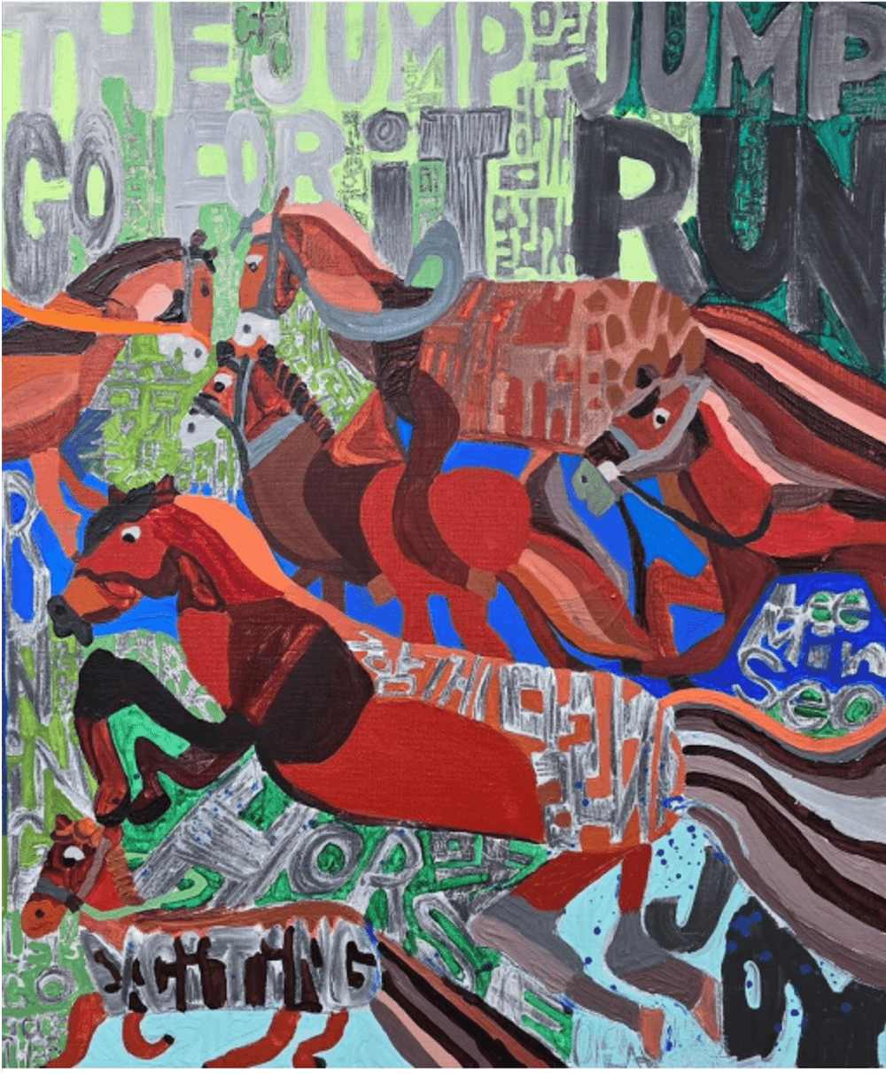 최우수상을 받은 정장우의 ‘흔들림 속에 꼿꼿함’은 무엇보다 역동적인 리듬과 충돌하는 색채 감각이 눈에 띄는 작품입니다. 인물은 어딘가에 앉아 편하게 머리를 괴고 있는 것 같지만 자세히 들여다보면 머리를 바닥에 처박고 고꾸라진 모습으로 보이기도 합니다. 뭉크의 절규하는 인물의 표정이 옆에 등장하는 것으로 보아 이 인물은 꽤 큰 충격으로 흔들림을 겪으면서도 어떻게든 꼿꼿함을 유지하려 애쓰는 것 같습니다. 언뜻 무거울 수 있는 주제를 가볍게 풀어나가는 유머 감각이 굵고 거친 선과 그림 곳곳에 삽입된 글자, 높은 채도의 색과 보색 대비, 덧칠과 긁힘의 회화적 기법과 세련되게 결합해 있습니다.